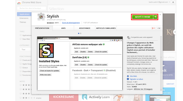 عليك الآن الذهاب إلى أي موقع من المواقع التي تدعمها الاضافة ، على سبيل المثال نختر يوتيوب . بعد ذلك يجب ان تقوم بالنقر على ايقونة الاضافة وستظهر لك نافذة جديدة تختار منها خيار "Find more styles for this site."